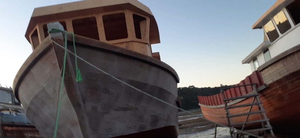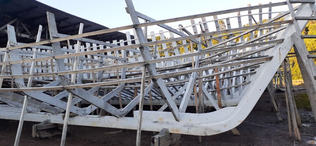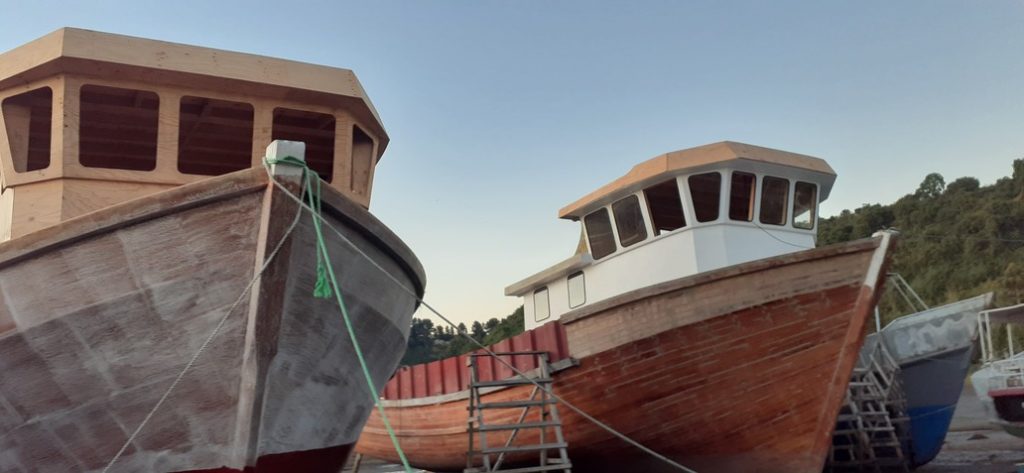 Embarcaciones inéditas, en proceso de restauración, mantenimiento o renovación, se encuentran estacionadas a orilla de mar son apreciables a simple vista junto a la acción de las personas que las intervienen.