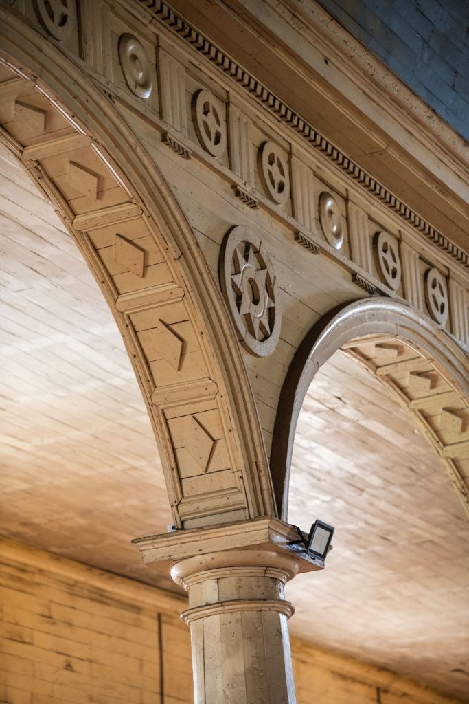 La iglesia actual está construida sobre otra más antigua, lo que se puede evidenciar al observar las bases de la antigua iglesia a través de una pieza de vidrio ubicada en el suelo del altar. Los altares lucen curiosos y coloridos diseños, los cuales fueron descubiertos por un sacerdote al raspar la última capa de pintura.