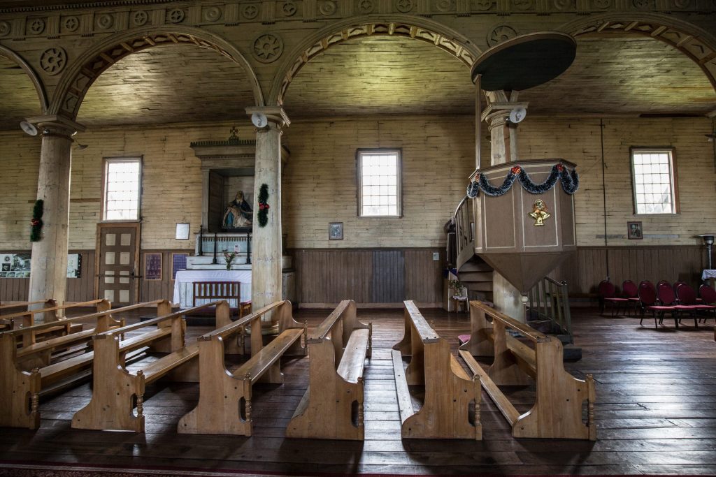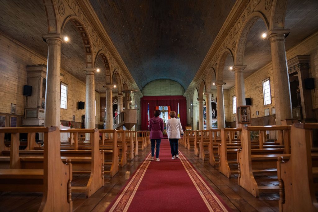 La iglesia de Chonchi destaca de inmediato por el colorido de su fachada y su torre. En su interior, llaman la atención las figuras geométricas talladas entre y sobre los pilares, además de las estrellas blancas que adornan su bóveda central. Según los lugareños, estas estrellas representan las constelaciones del cielo nocturno con un nivel de detalle tan impresionante que, a la fecha, no han podido ser restauradas.