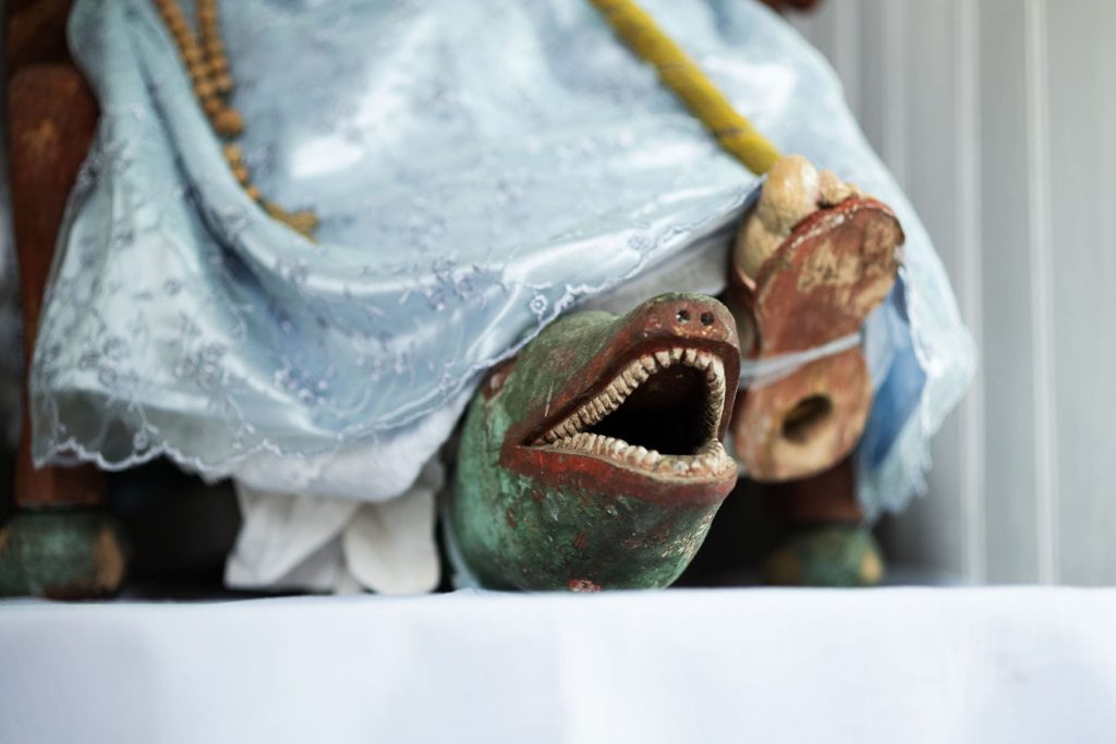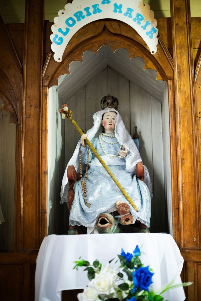 Entre las imágenes de la iglesia, destaca la ‘Virgen sentada», que representa a la Inmaculada Concepción en un trono de madera, pisando a un demonio en forma de serpiente. Esta imagen es única en el archipiélago y se asocia directamente con la localidad, dado que nombre mapudungún de Vilupulli, se traduce como’Loma de la culebra» o ‘Colina de la serpiente».