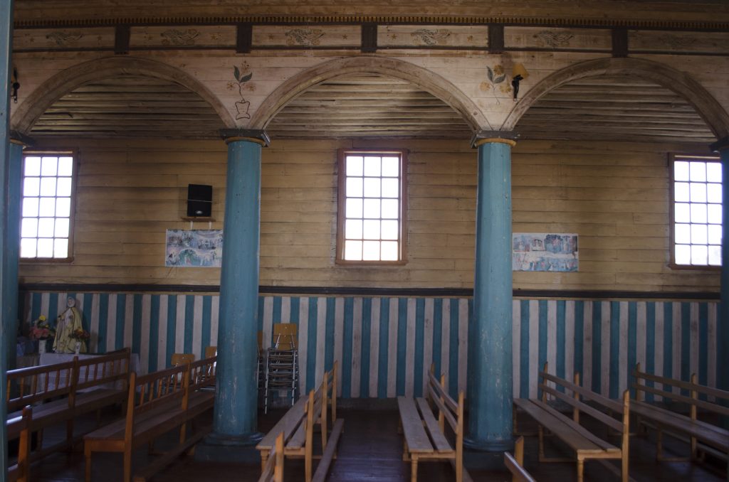Su nave central presenta una bóveda de cañón corrido sostenida por pilares separados por arcos de medio punto. Su cielo abovedado está salpicado por cientos de pequeñas estrellitas amarillas. Entre los arcos que separan a la nave central de los pasillos laterales tiene decoraciones con flores pintadas en rojos y amarillo.
