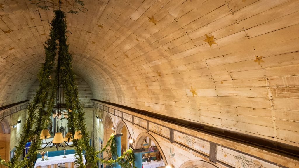 Al igual que la iglesia de Vilupulli, llama la atención su estilizada torre.En el interior destaca su bóveda central, que luce estrellas pintadas con productos naturales de la zona, al igual que las flores rojas y amarillas que adornan los arcos entre los pilares.