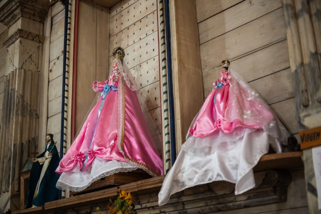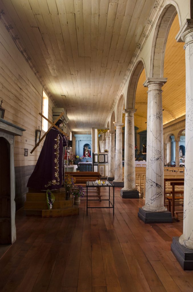 Se expone en su interior una lancha chilota y cuelgan del techo pequeñas embarcaciones. Estas son ofrendas de fieles navegantes, para quienes antiguamente la iglesia cumplía el rol de faro. (Fuente: PTI Iglesias Patrimoniales de Chiloé. (s.f.). Recuperado el 25/09/2025 de sitio web: https://www.rutaiglesiaschiloe.cl/iglesias/nercon)